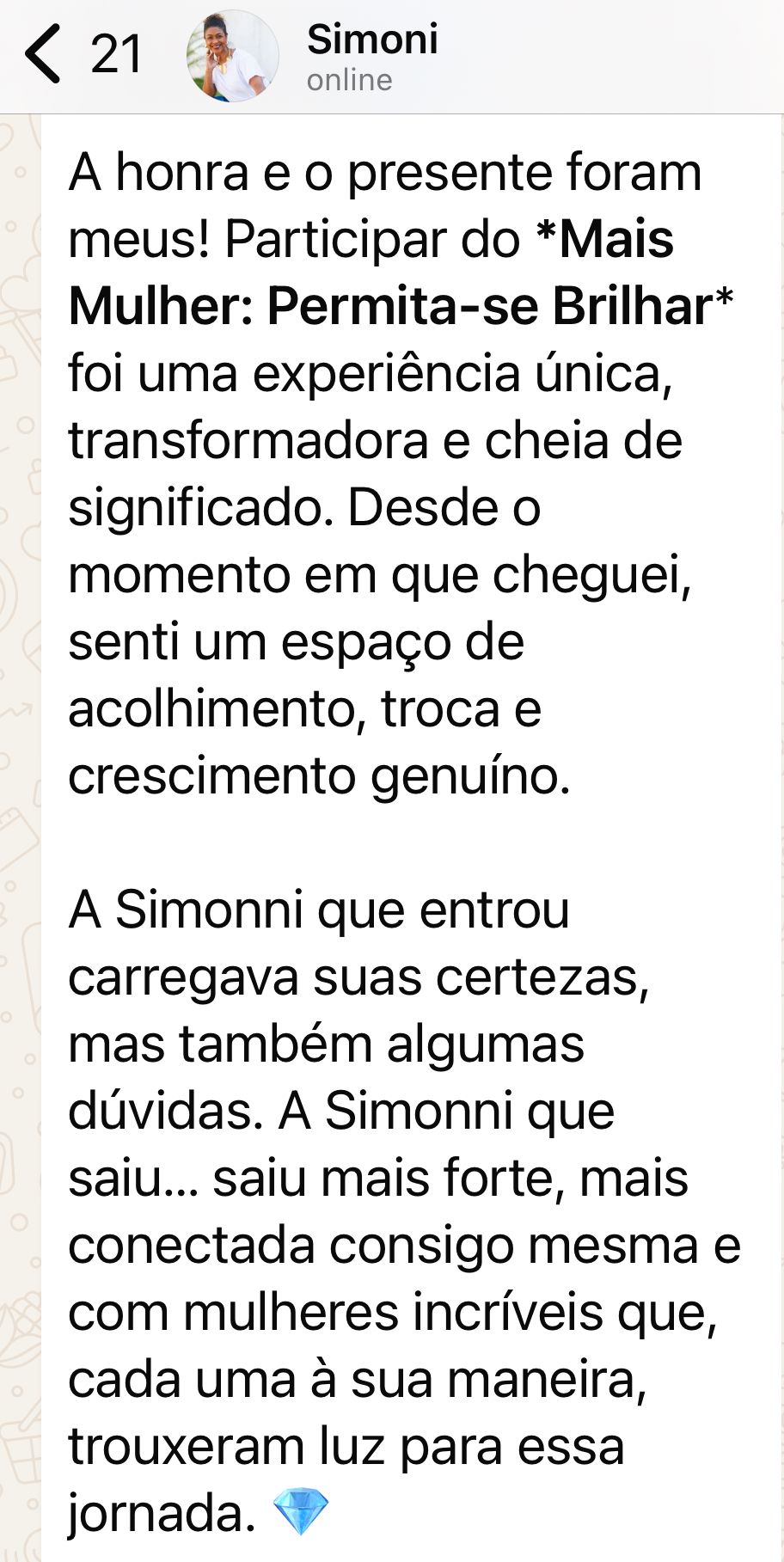 É por isso que eu criei a imersão Mais Mulher: Permita-se Brilhar. Um espaço para você resgatar a sua voz, sua autoestima e a sua confiança.